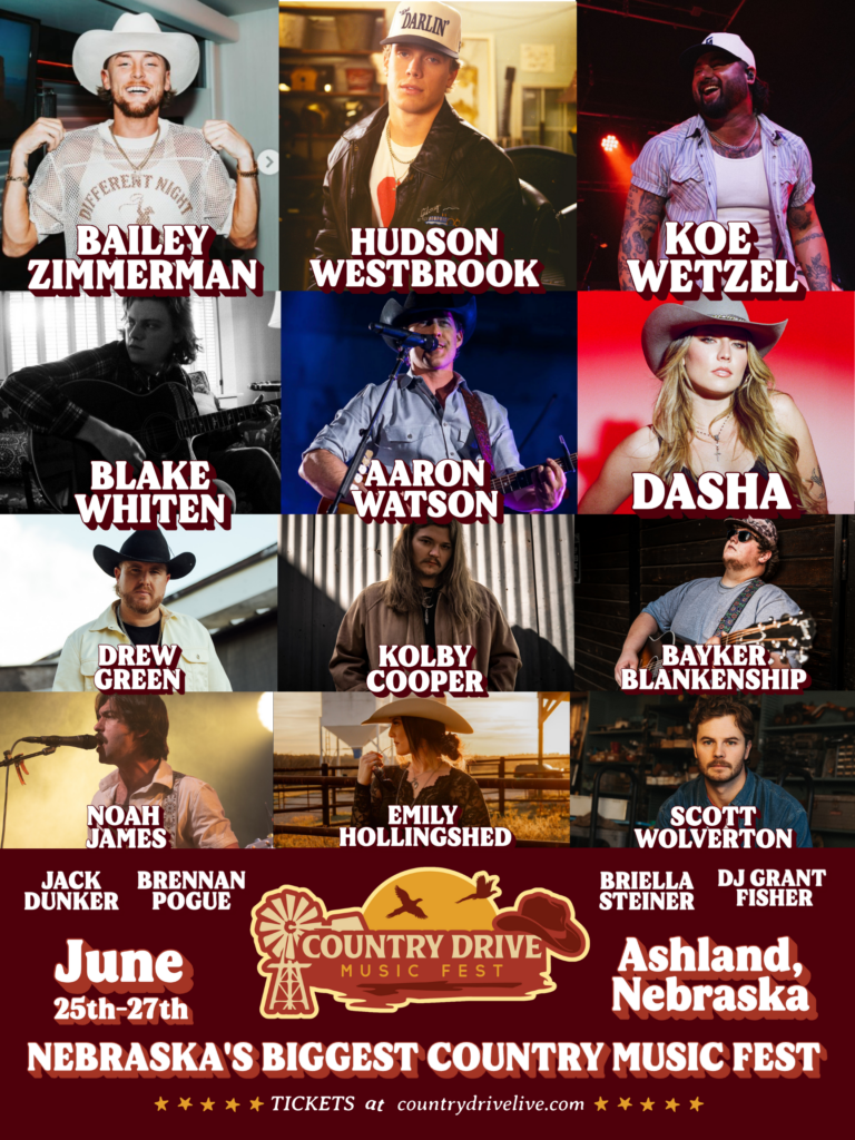 Country Drive Live is a family-owned, 40-acre music venue tucked inside Country Drive Golf Course just outside Ashland, Nebraska. What started as a family dream in 2023—to bring great music and “Country Nights Done Right” to our own backyard—has quickly grown into Nebraska’s largest homegrown music festival.